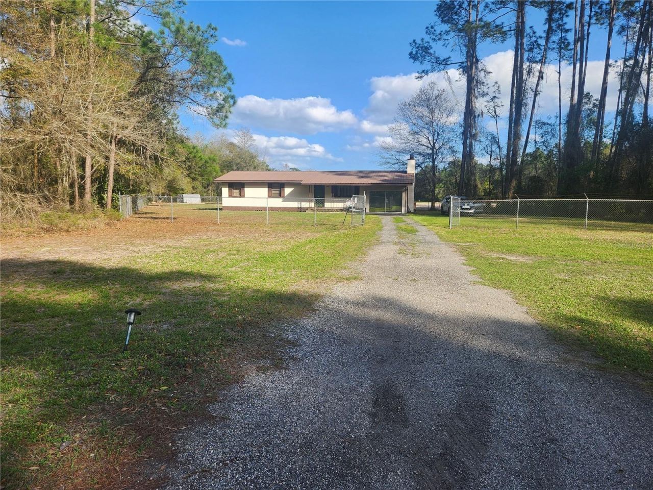 Wow Step into vintage charm with this 2 bedroom, 2 bath home located on fenced, gorgeous 1 acre of private land and right near growing Keystone Heights & facing west to see some amazing sunsets. This 2 Bedroom used to be a 3 Bedroom and could be easily converted back, or you could use it as an office or nursery or just enjoy an oversized Master Bedroom. Recent updates include putting a door to the back of the property and adding a 16x16 Deck. There are newer Laminate floors installed throughout except for the Family Room which is a cozy room with Stone wall Fireplace with mantle and Wood-Burning Stove. The Kitchen has been updated with Bay Windows, Built-in Desk & lots of cabinets. The black and white retro bathroom displays timeless elegance. There is also a bath off the bedroom. The Dining Room has a Pantry. Ceiling Fans throughout the home and plenty of closets. The metal roof has a remaining life of approx. 30 years. The 80 Sonos Soundbar TV and the 75 Sonos Soundbar TV can stay and most furniture/appliances unless you don't want them. The property is zoned residential but could easily be converted if you want to have a business there too. Want chickens? There chicken coops and greenhouse for your pleasure. Follow the trails in the woods and enjoy nature, freedom and meditation. Also give you plenty of wood for the wood burning stove. The land adjacent to the property has been purchased and cleared and believed to be new homes which should increase the value for the area. Close to Keystone Heights for restaurants, parks, bike and walking trail, shopping & more! PRESENT ALL OFFERS!