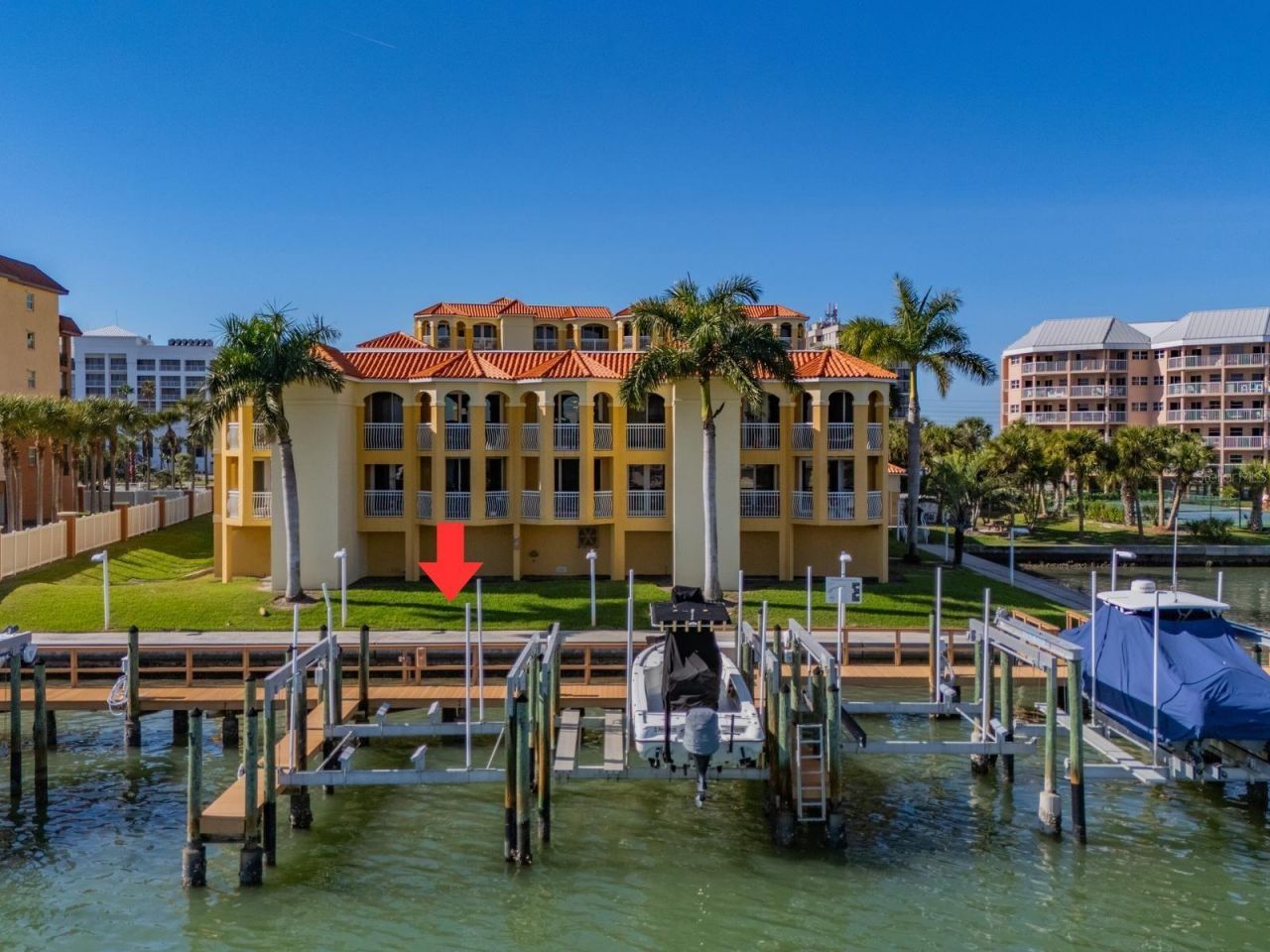 Experience elevated coastal living in the largest residence at Bella Grande, offering approximately 3,320 square feet of beautifully designed space with DEEDED BOAT SLIP #4. This exceptional top-floor condo (no noise from above) is located in the very quiet Building B which features just seven total residences, creating a peaceful, private atmosphere with stunning views of Boca Ciega Bay. The home offers three spacious bedrooms; each is en-suite with a full bathroom plus a convenient half bath near the kitchen ideal for guests. Designed for both comfort and entertainment, the layout includes two distinct living areas: one overlooking the resort-style pool and the other capturing sweeping bay views. At the heart of the home is a completely remodeled kitchen (completed 2019) featuring Monogram appliances and an impressive, oversized island, with seating for four or more. The space is perfect for gatherings! Adjacent to the kitchen is a dedicated bar and wine area, complete with a dual-zone Vino Temp wine refrigerator with a 108-bottle capacity, a beverage cooler, and seating for five. The private office with French Doors offers a built-in desk, drawers, filing cabinets, and shelving, making it ideal for working from home or managing personal affairs. Boating enthusiasts will appreciate the deeded deep water boat slip (Slip #4), equipped with a 20,000 lb. lift. Boardwalk and docks were substantially renovated in 2018 including incasing the piers in concrete. Boating access to the Gulf of Mexico is a short 15-minute boat ride. Additional premium features include two new 3-Ton 18 SEER variable-speed HVAC systems (new in 2023), a new 55-gallon water heater, two dedicated covered parking spaces, and an exceptionally large private on-site storage unit measuring approximately 21' x 11.5. HOA is in full compliance with SIRS including robust capital reserves. With its unmatched size, thoughtful upgrades, and prime waterfront setting, this residence offers a rare opportunity to own a truly special condo at Bella Grande. This is a beautiful community where luxury, privacy, and the coastal lifestyle come together seamlessly. A quick 20-minute drive to bustling downtown St. Petersburg and all it has to offer and a short 5 min. walk directly across the street to the sugary white sands of the Top-Rated St. Pete Beach. Call today for your private showing!!Bonus Boat Slip - If interested, a second boat slip (Slip #7) is available for purchase. Slip #7 also features a 20,000 lb. lift.