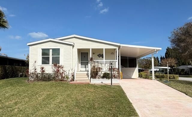 LOCATION! Sitting on a beautiful large corner lot in Cambridge! Nice 2 bed 2 bath home is waiting for you!! The home has nice natural light with spacious rooms thru-out. Big Primary Bedroom with walk-in closet. Primary Bath has shower and plenty of storage. Eat-in Kitchen and Formal Dining Room. Indoor Laundry Room with storage. Front porch and large screened in patio, attached utility shed, and covered Carport. New AC is July 2025, new washer Sept 2025. HWH is approx 20 yrs old but well maintained. The Cambridge Community has low HOA, Clubhouse, Pool, Fitness Center, Library, and Shuffleboard. Easy to show! Your new home awaits!